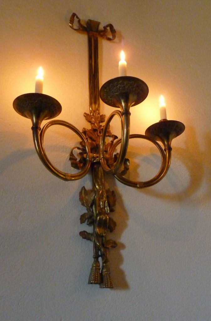 Paire d’appliques en bronze doré à trois bras de lumière en forme de cors de chasse à décor en bas relief de frise de pampre, platine rubannée à décor de feuilles de chêne, jarret de chevreuil posé en trophée et chutes de cordons de passementerie.